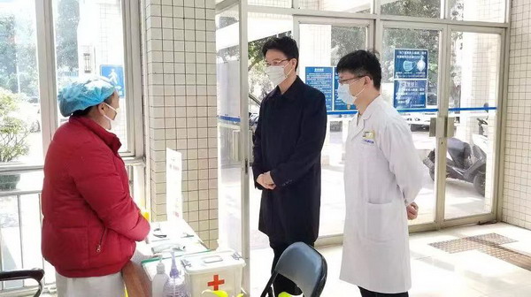 首先,梁培招理事长一行实地查看预检分诊台,询问转运流程,详细了解疫情防控、人员值班、在院病人、物资储备、后勤保障、隔离措施等情况,并听取市残联康复医院曹全荣副院长汇报应对疫情的各项措施,以及反映了当前面临的困难。