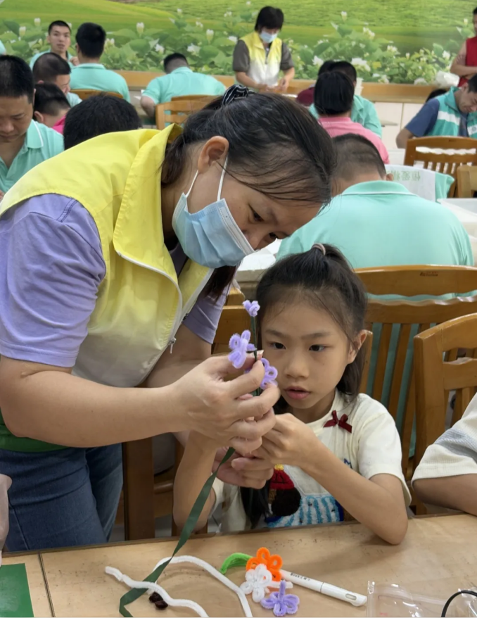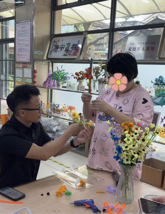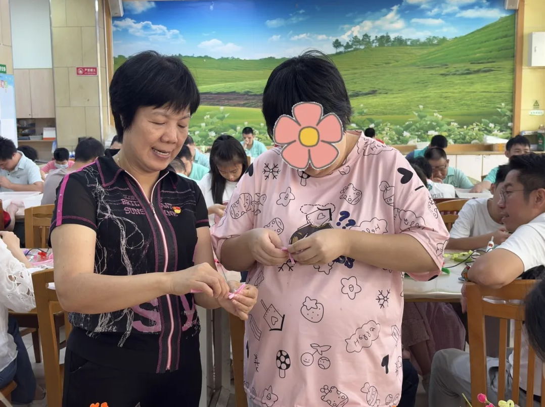 进入手工协作环节,参与人员体验庇护工场产品的生产制作流程,并与残疾学员携手制作扭扭花棒。在一折一绕的协作过程中,双方相互配合,现场氛围温馨融洽。这一环节不仅让参与人员亲身体验到残障学员的劳动成果,更通过实际行动传递了关爱,助力残疾学员增强自信心与社会归属感。