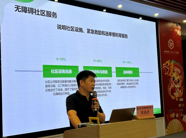 专题培训环节,蓬江区残联无障碍巡查督导导师黄嘉爵作《无障碍环境巡查知识科普》专题讲座,系统讲解无障碍设施国家标准、法律法规及巡查技巧。