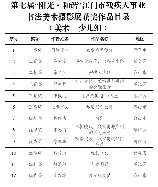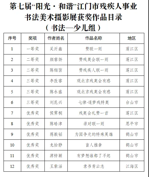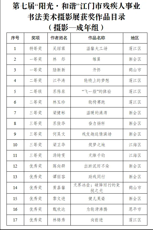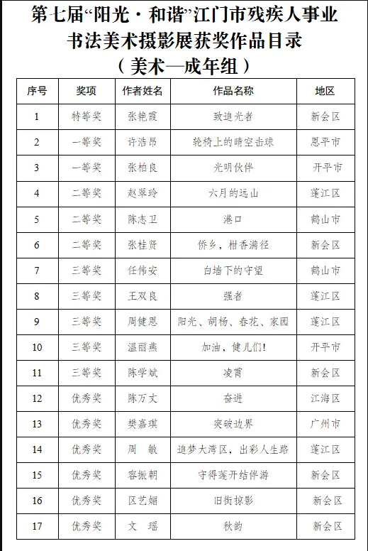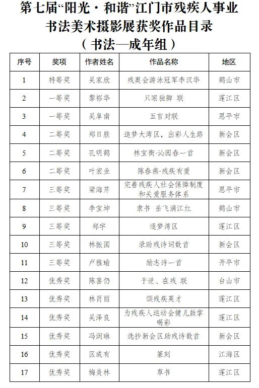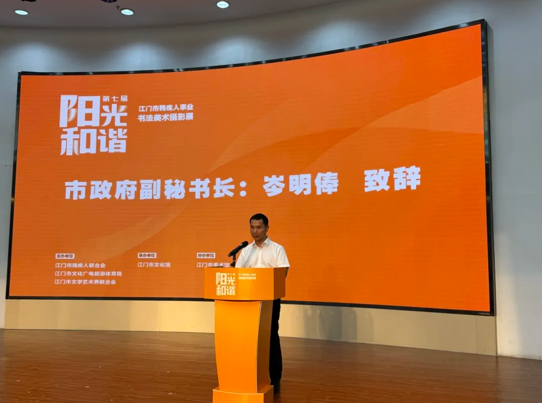 9月15日,由江门市残联、市文广旅体局、市文联共同举办的第七届“阳光·和谐”江门市残疾人事业书法美术摄影展在江门市文化馆隆重开幕。市政府副秘书长岑明俸,市残联党组书记、理事长叶芳华以及市直相关部门领导、十五运会及残特奥会江门赛区执委会成员单位代表、获奖者代表还有市民们共同参与了这一极具意义的活动。