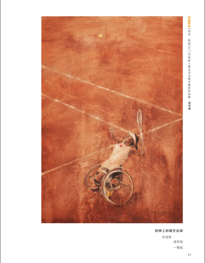 开幕式当天,展厅内人流如织。来自蓬江区的教师李女士在一幅名为《轮椅上的晴空击球》的油画前驻足良久。画作定格了轮椅运动员挥拍扣杀的刹那——她身体后仰,手臂高扬,蓄势待发,奋力拼搏的姿态迸发出强大的生命力。“完全被震撼了,”李女士说道,“作者以鲜明的红色基调象征蓬勃的生命力,红白对比的构图将视线聚焦于主角。这些作品让人感受到的并非残缺,而是生命无限的可能。”